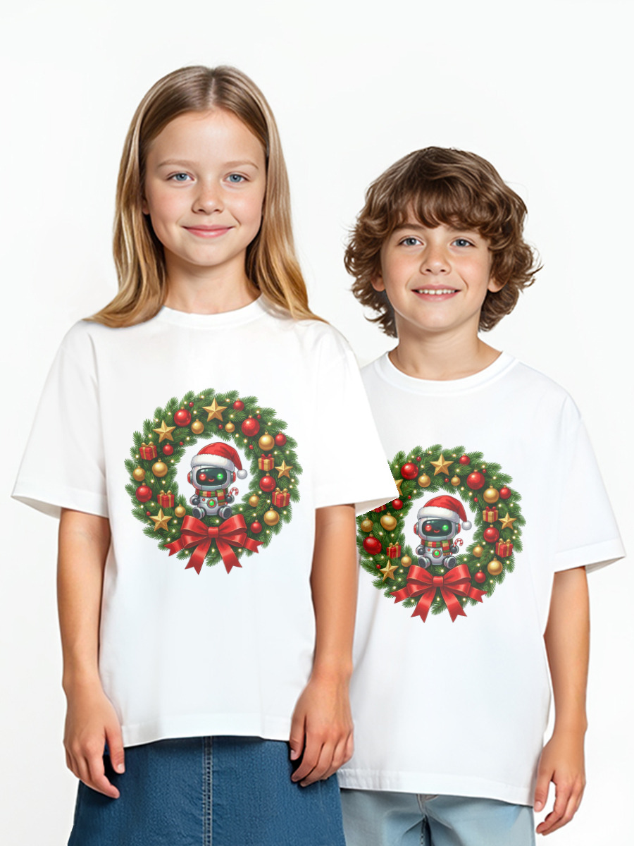 Детская футболка «Новогодний венок с роботом в колпаке»