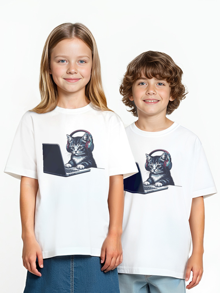 Детская оверсайз футболка «Милый котик в наушниках за ноутбуком»