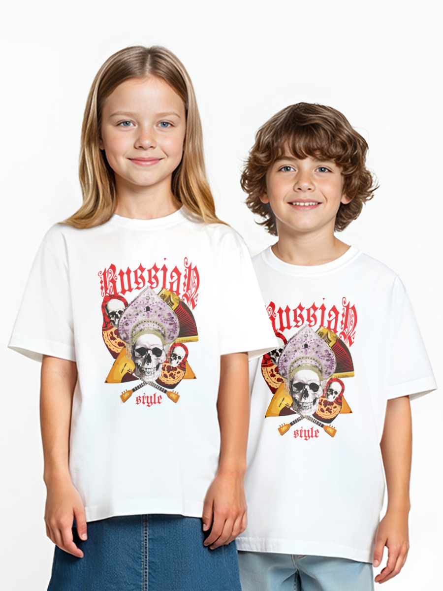 Детская оверсайз футболка «Череп в кокошнике и матрёшки с балалайками»