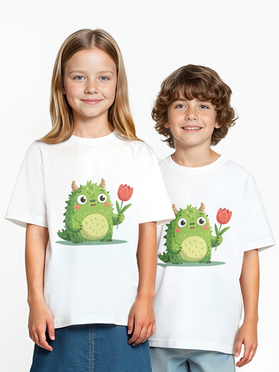 Детская оверсайз футболка «Зелёный монстрик держит в лапке красный тюльпан»
