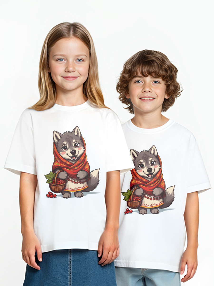 Детская оверсайз футболка «Волчонок в платке с корзинкой ягод»