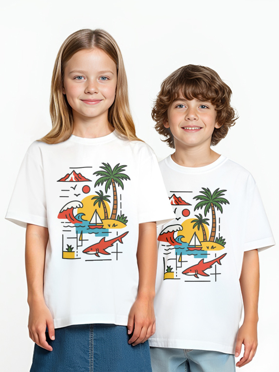Детская оверсайз футболка «Тропический пейзаж: корабль, акула и горы»