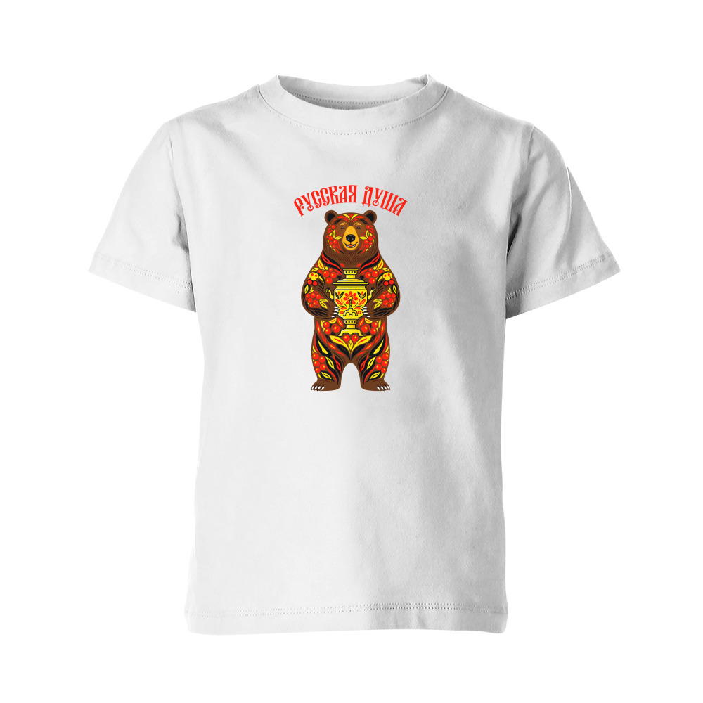 Детская футболка «Русский медведь с самоваром в традиционных узорах»