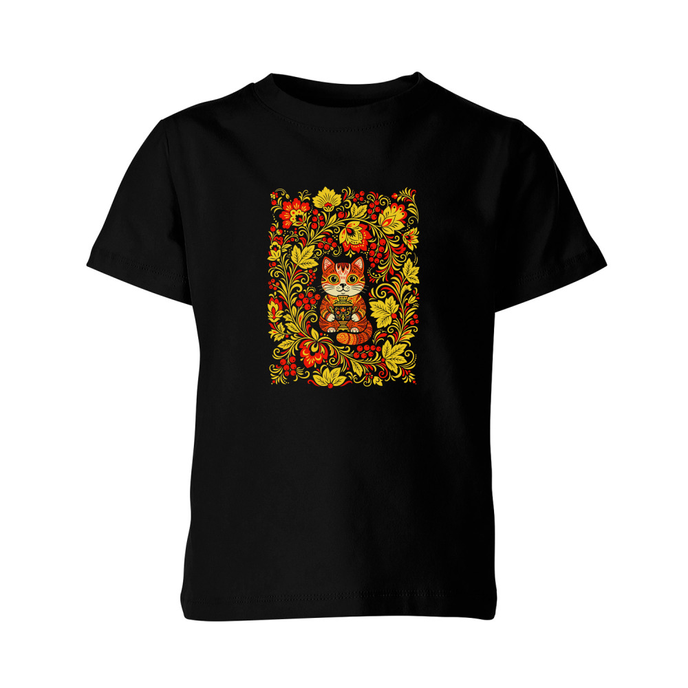 Детская футболка «Узор русская хохлома - кот с самоваром»