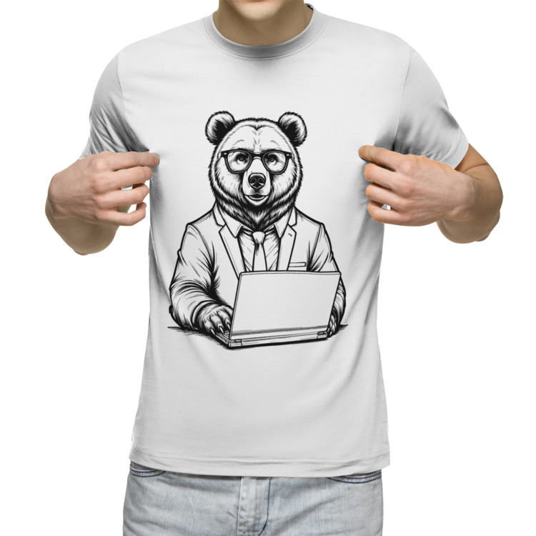 Мужская футболка «Деловой медведь за ноутбуком»