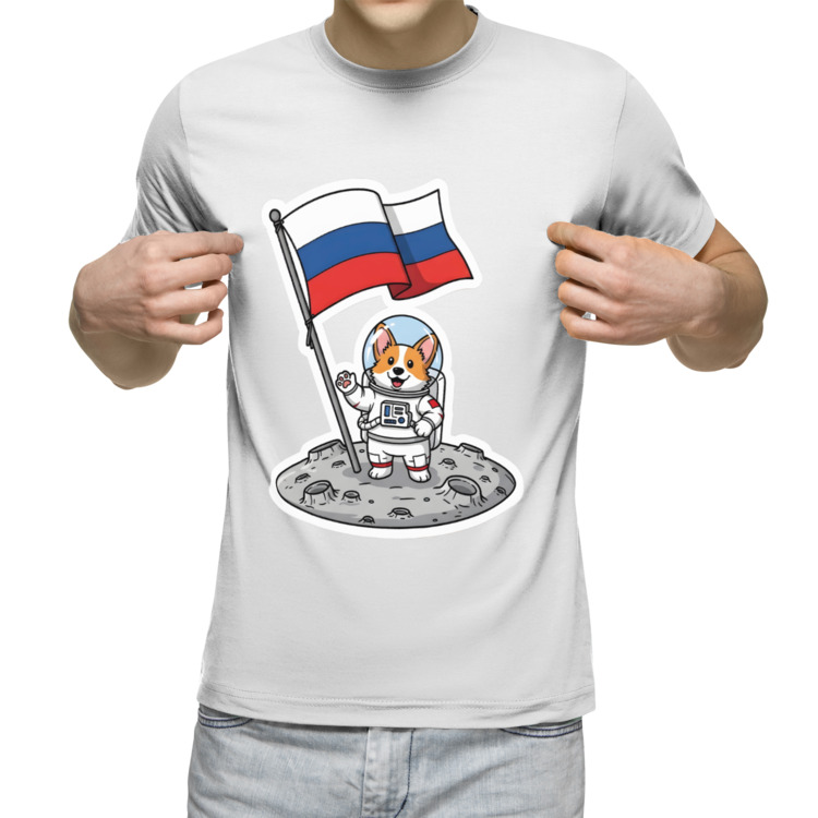Мужская футболка «Корги-космонавт машет флагом-триколор на Луне»