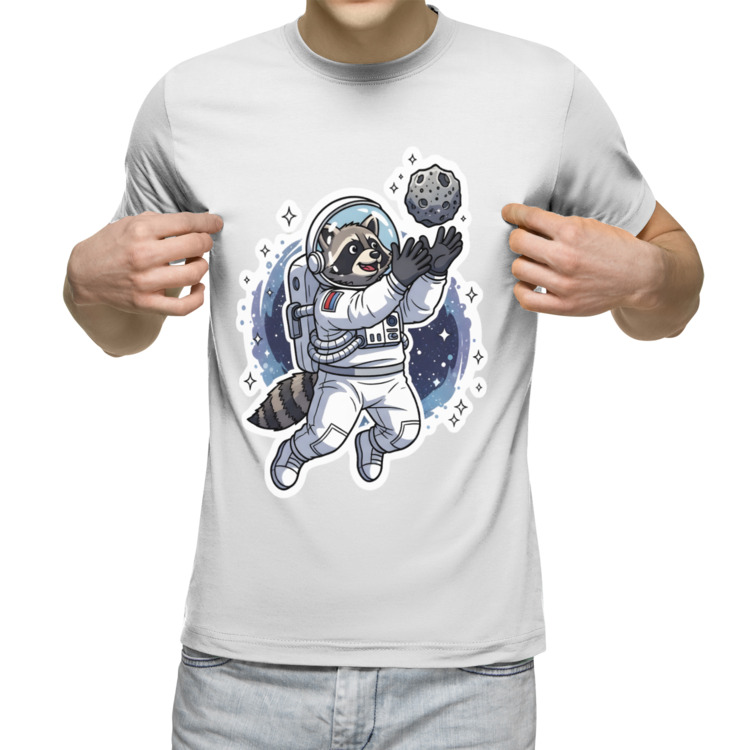 Мужская футболка «Енот-космонавт ловит астероид как мяч запасной»