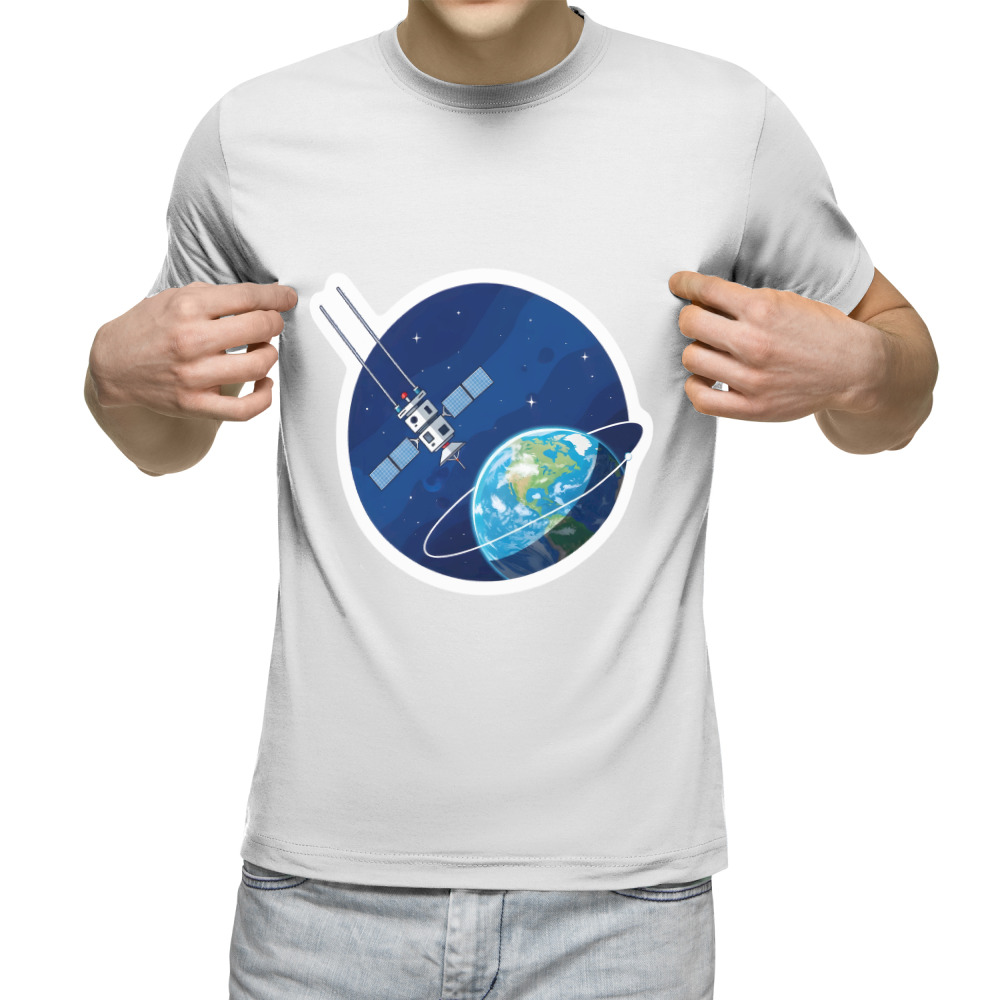 Мужская футболка «Спутник с антеннами летит вокруг планеты»