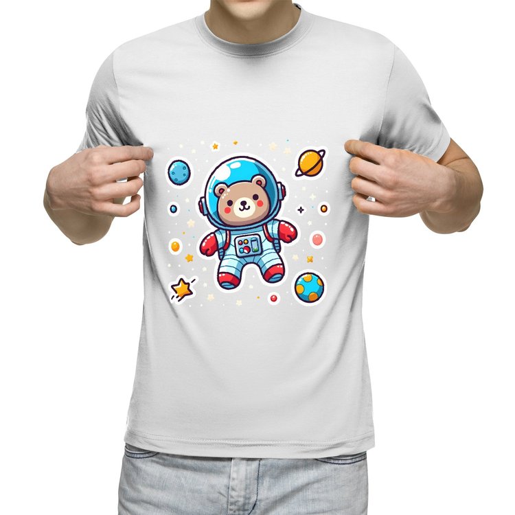 Мужская футболка «Медведь-космонавт, белый, синий, красные»