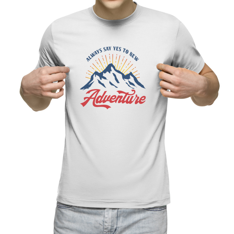 Мужская футболка «Новое приключение. Горы, солнце и надпись.»