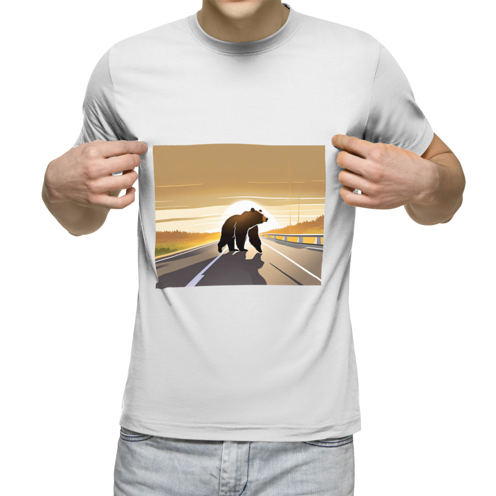 Мужская футболка «бурый медведь на автостраде на закате»