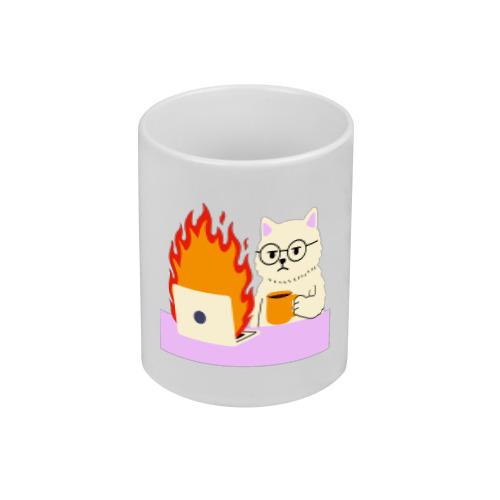 Кружка «Кот с кружкой у пылающего ноутбука»