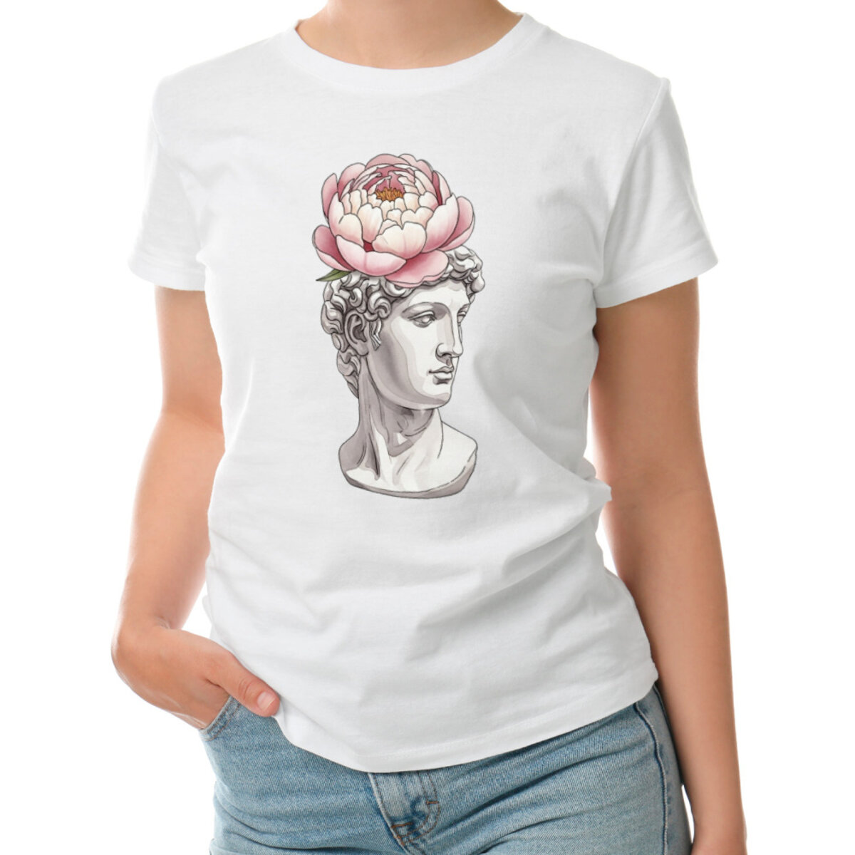 Женская футболка «Античный Давид с пионом: классика и флористика»