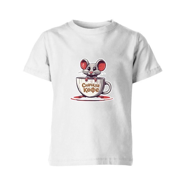 Детская футболка «Мышь с кружкой и надписью Сначала кофе»