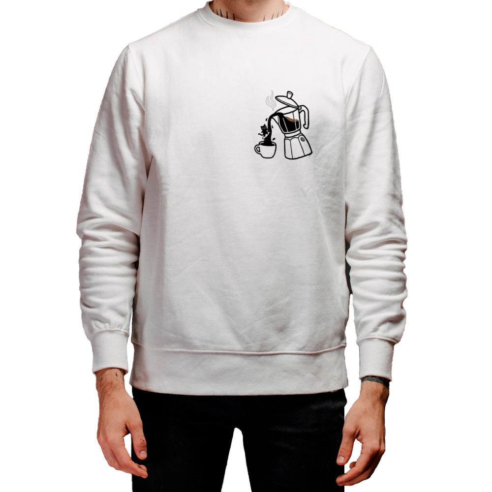 Мужской свитшот «Кот сёрфит на кофе из кофеварки, подарок бариста»