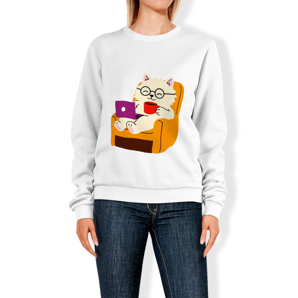 Женский свитшот «Кот в очках с чашкой у ноутбука в кресле»