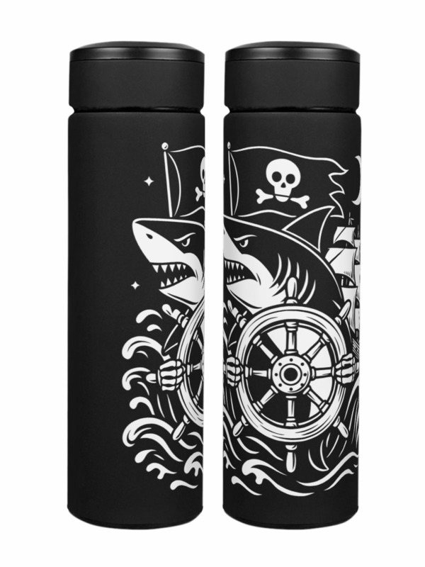 Термос «Акула за штурвалом с пиратским кораблем в море»
