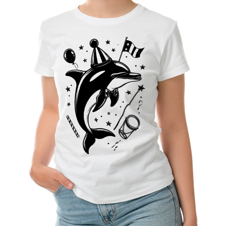 Женская футболка «Дельфин-клоун в праздничном наряде»