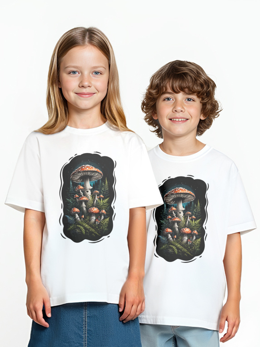 Детская оверсайз футболка «Мистический лес, ночь, грибы мухоморы и папоротник»