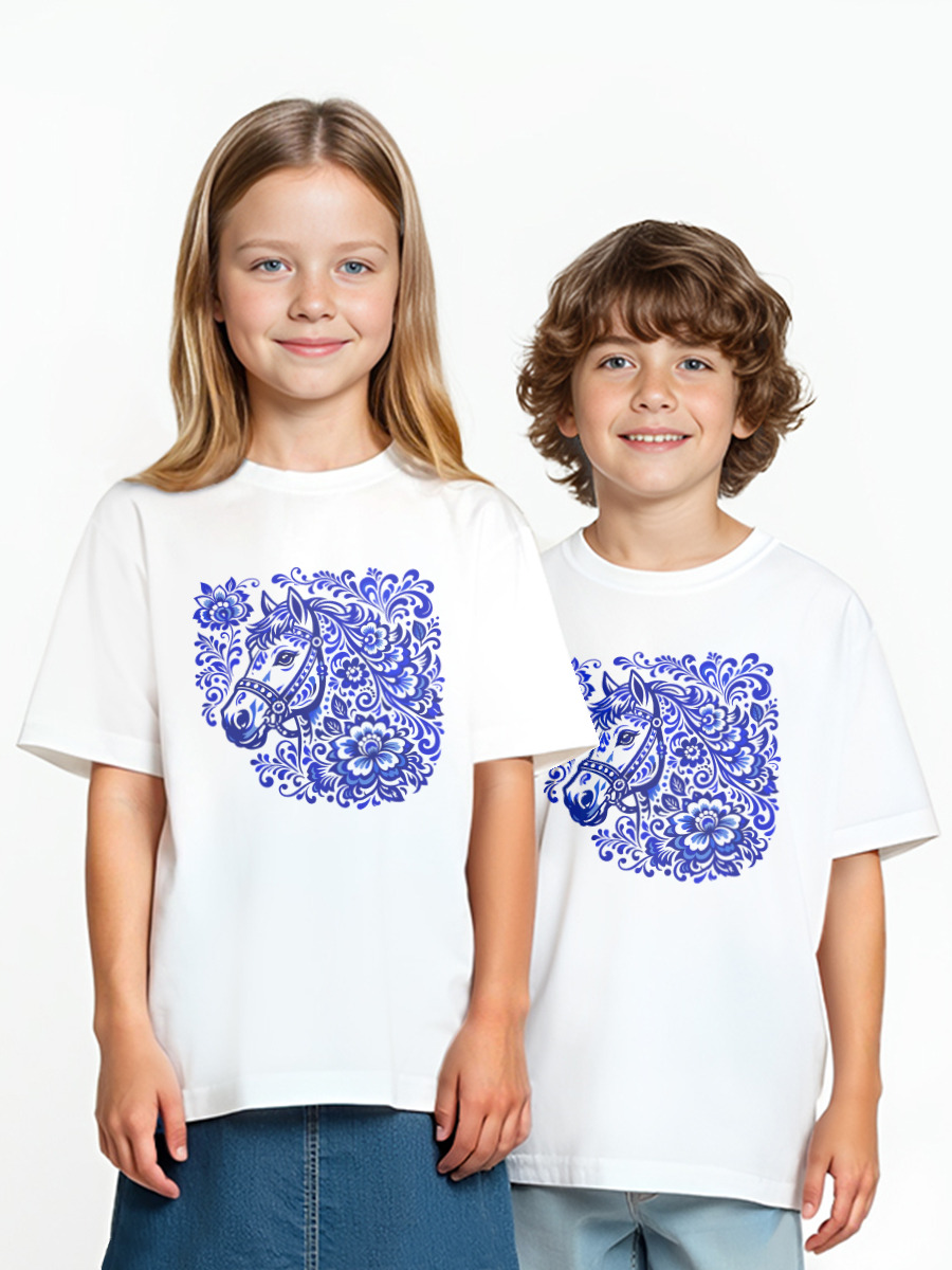 Детская оверсайз футболка «Гжель узор: лошадь в узорах - русский орнамент»