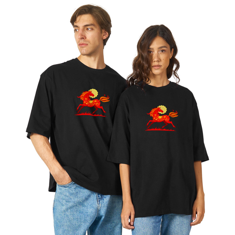 Футболка оверсайз «Красная огненная лошадь в этнических узорах»