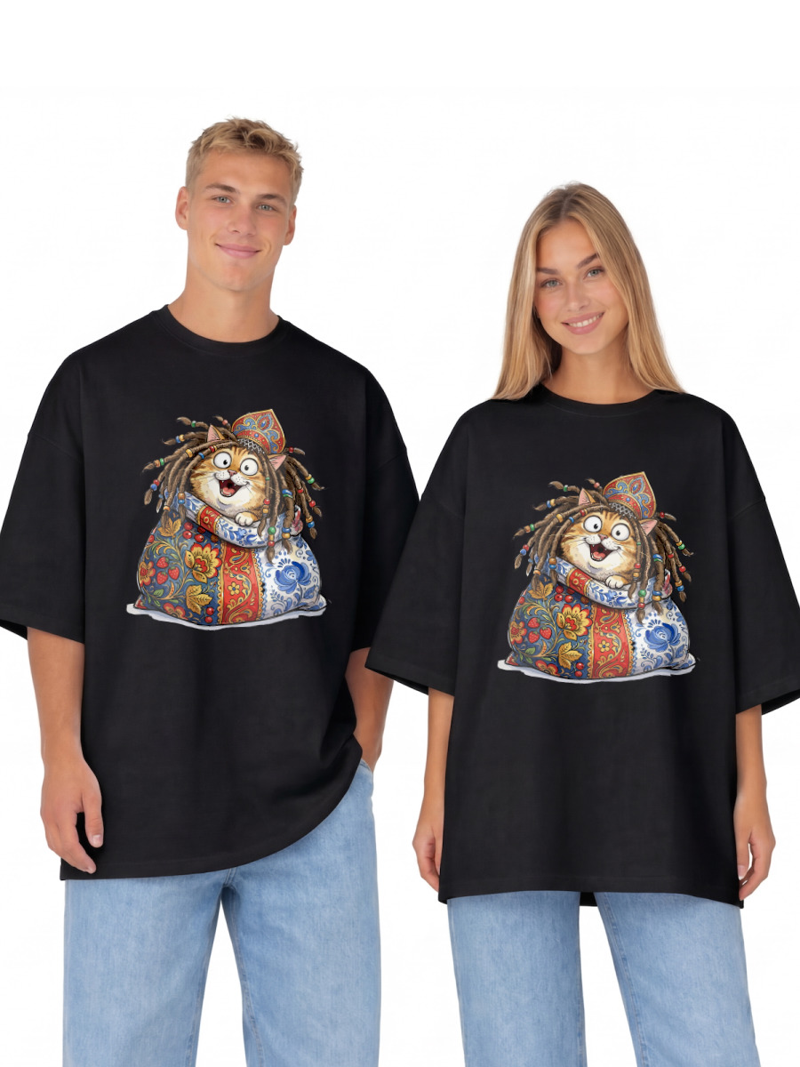 Футболка оверсайз «Кот в мешке, пословица, русский стиль, кокошник»