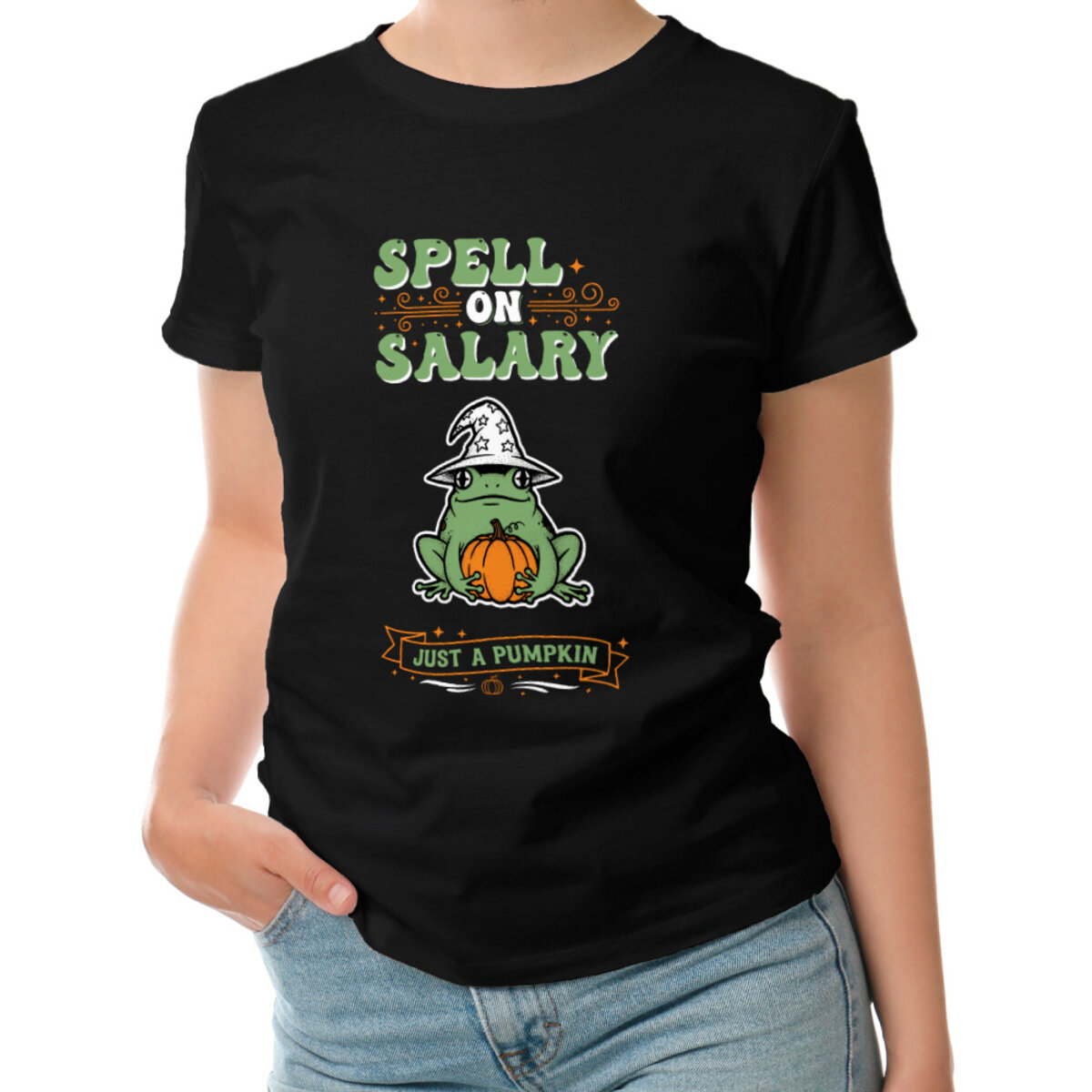 Женская футболка «Магия зарплаты. Лягушка с тыквой»