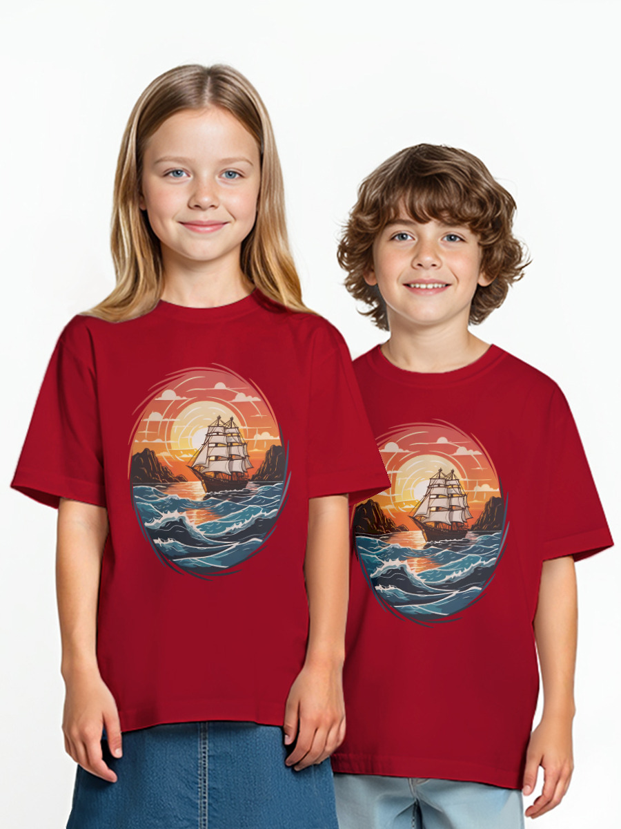 Детская оверсайз футболка «Парусник в море, корабль на фоне морского заката»