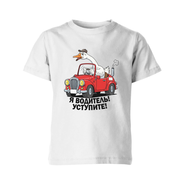 Детская футболка «Я водитель! Уступите! Смешной гусь на машине»
