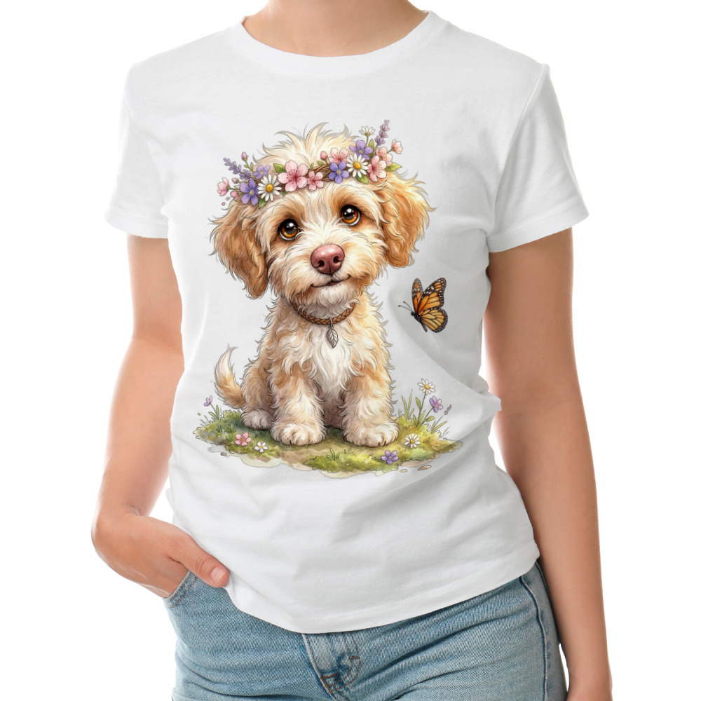 Женская футболка «Щенок в цветочном венке. Для любителей собак»