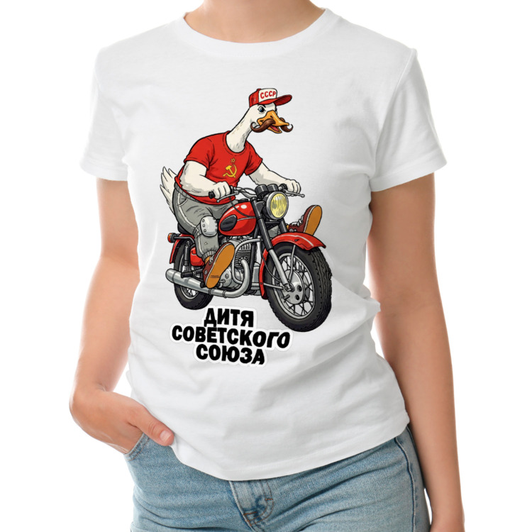 Женская футболка «Дитя Советского Союза. Гусь на мотоцикле. СССР»