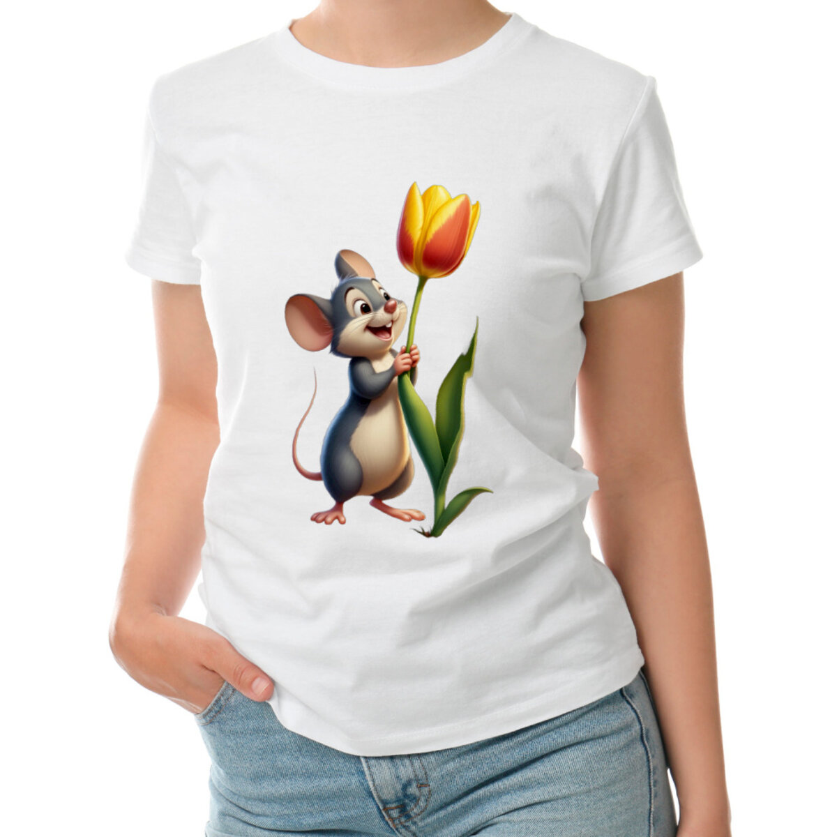 Женская футболка «Мышь с тюльпаном»