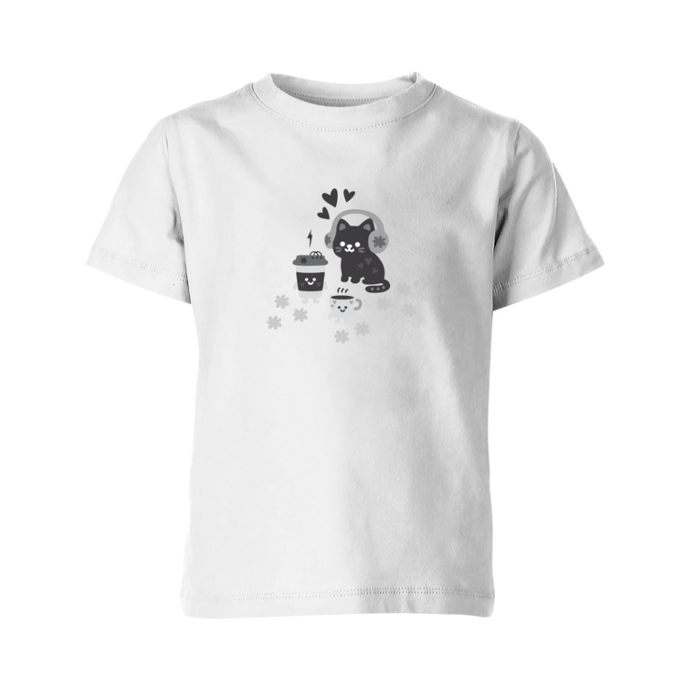 Детская футболка «Добрый кот в наушниках и утренний кофе»