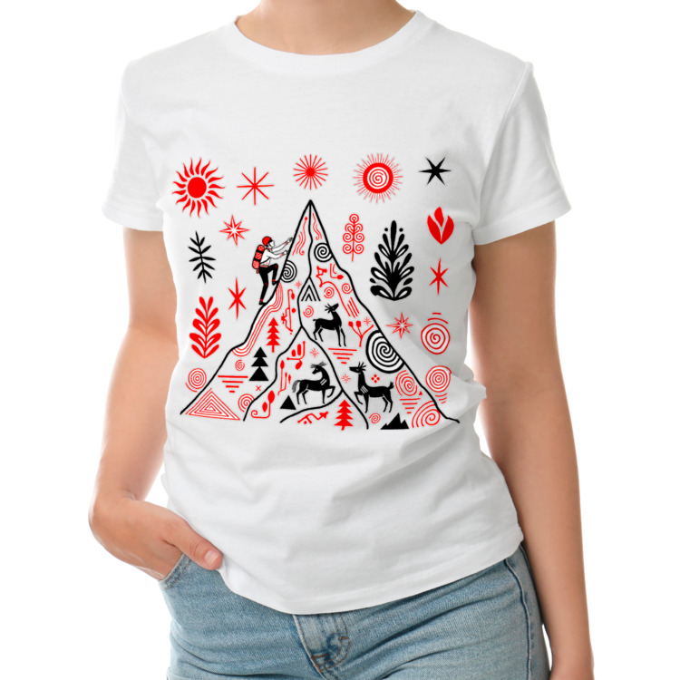 Женская футболка «Альпинист - скалолаз в стиле мезенской росписи»
