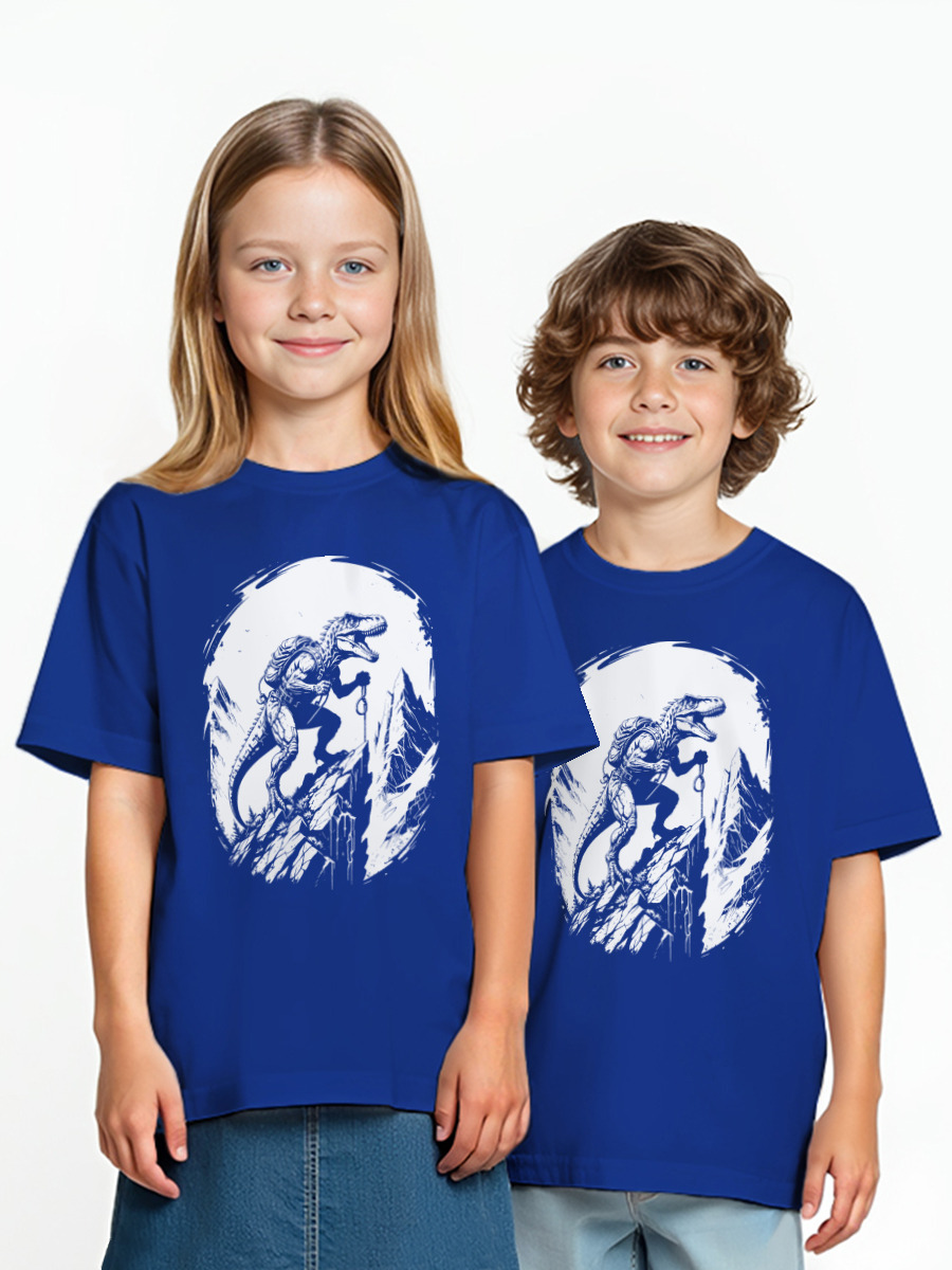 Детская оверсайз футболка «Динозавр-альпинист в горах»