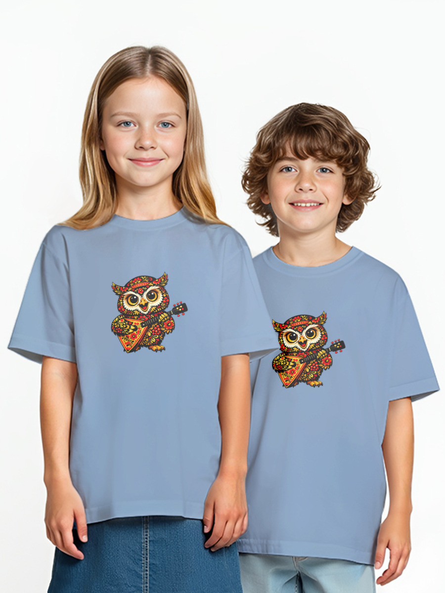 Детская оверсайз футболка «Весёлая сова с балалайкой- узор хохлома»