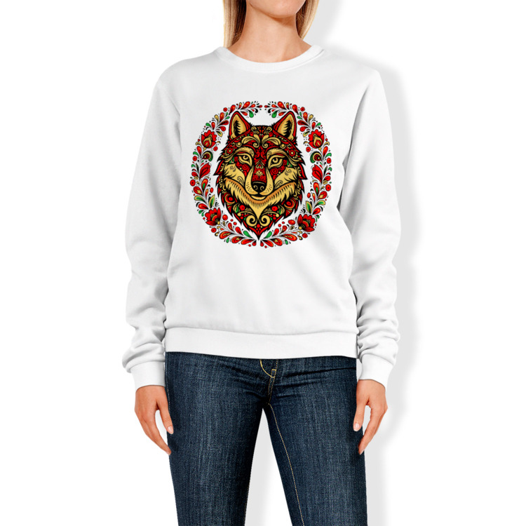Женский свитшот «Русский волк в народных узорах хохломы»
