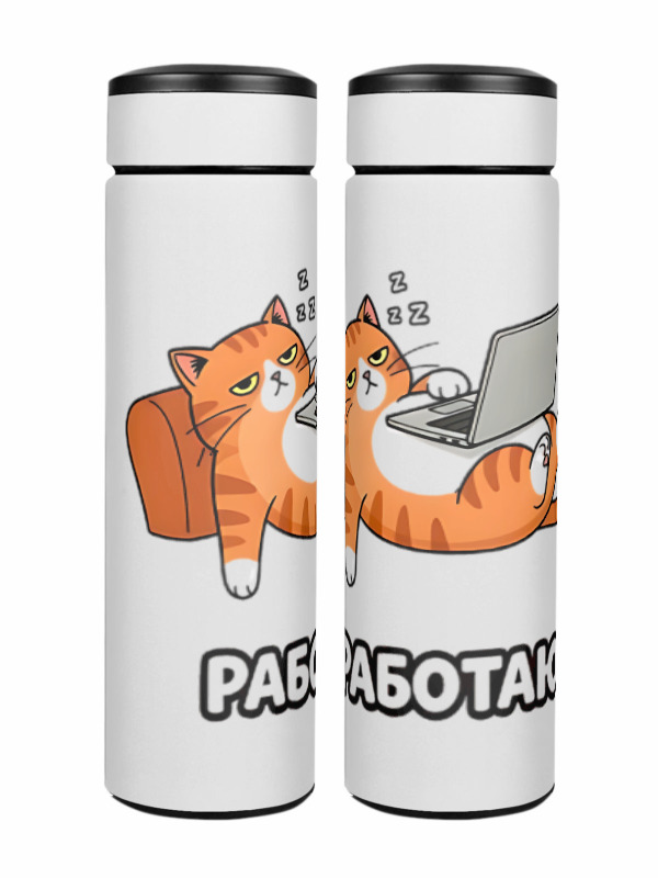 Термос «Ленивый кот с ноутбуком-РАБОТАЮ»