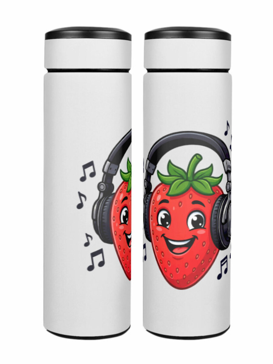 Термос «Клубника диджей в наушниках слушает музыку.»