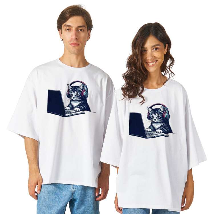Футболка оверсайз «Милый котик в наушниках за ноутбуком»