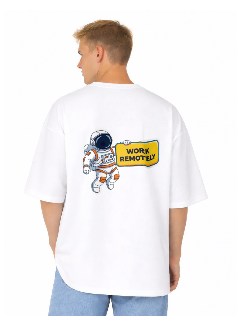Футболка оверсайз «Космонавт держит табличку Работаю удалённо»