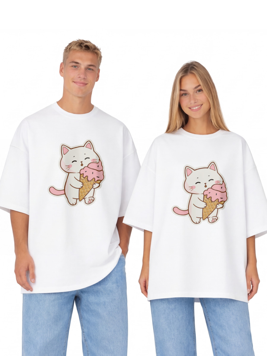 Футболка оверсайз «ПУХЛЫЙ КОТ ГРЫЗЁТ МОРОЖЕНОЕ ЖАДНО»