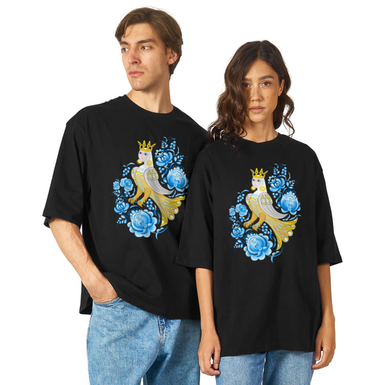 Футболка оверсайз «Птица Сирин среди синих цветов. Русский узор»