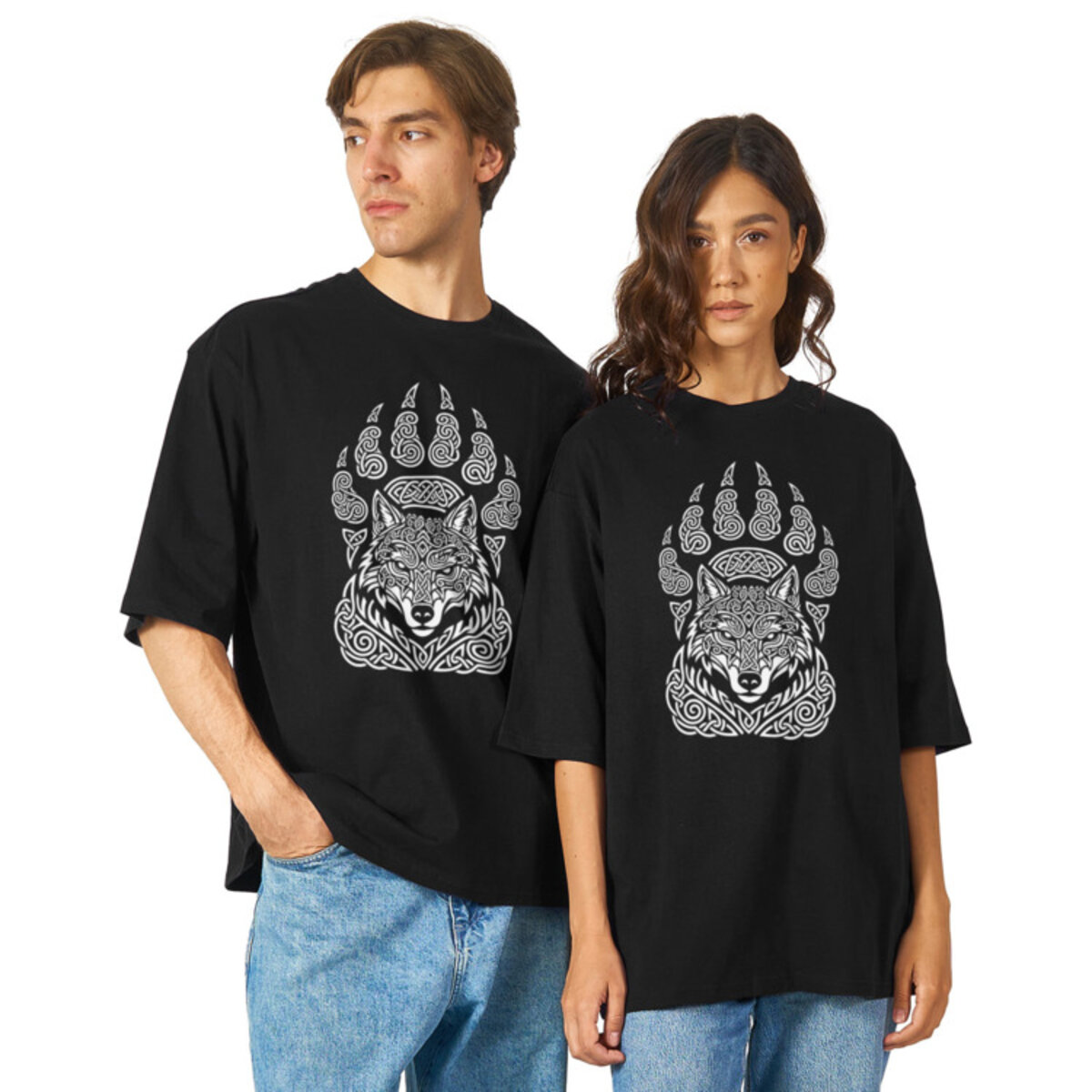 Футболка оверсайз «Мистический волк в узорах и шестипалой лапе»