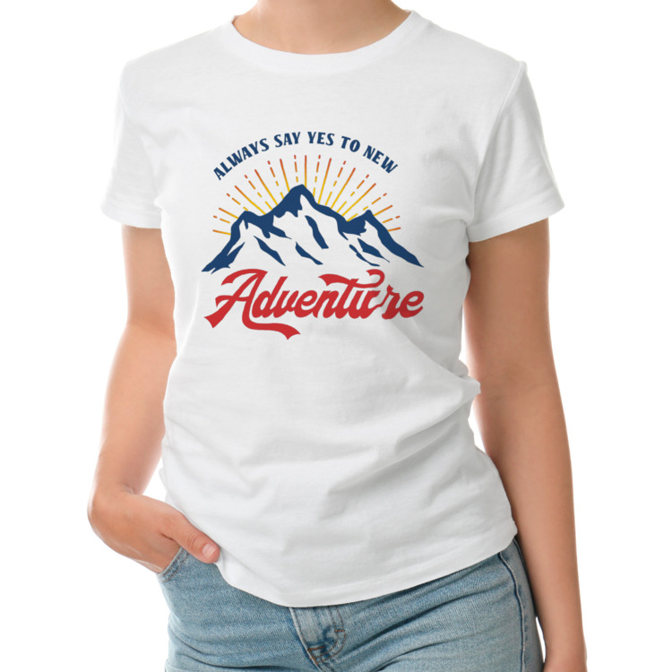 Женская футболка «Новое приключение. Горы, солнце и надпись.»