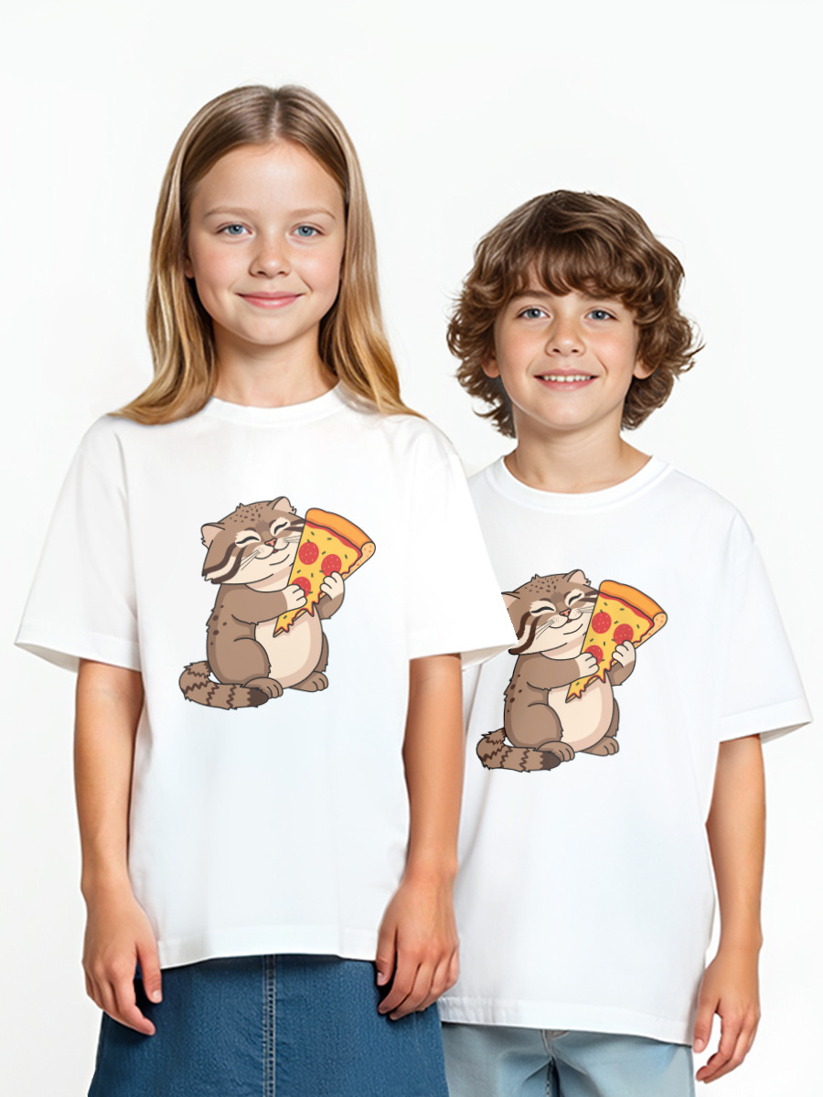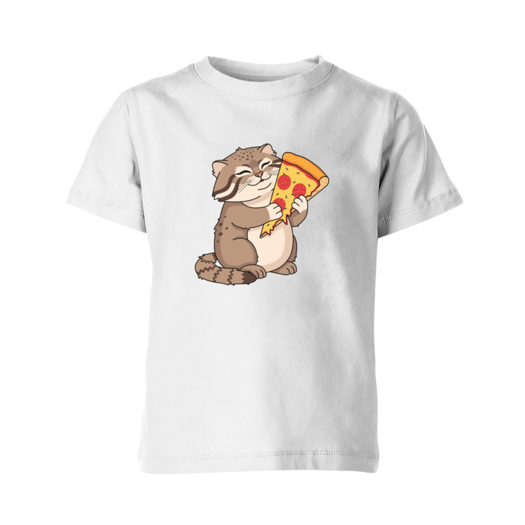 Детская футболка «Прикольный кот манул и пицца»