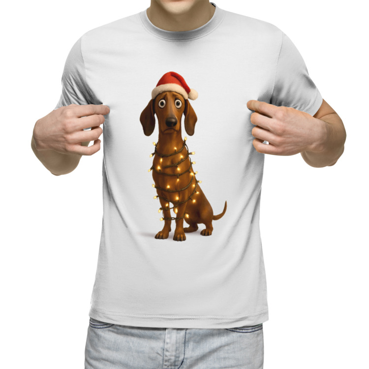 Мужская футболка «Удивленная новогодняя такса в гирлянде»