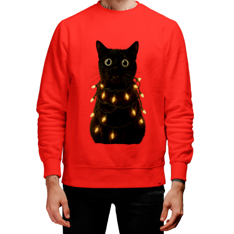 Мужской свитшот «Смешной черный кот в гирлянде»