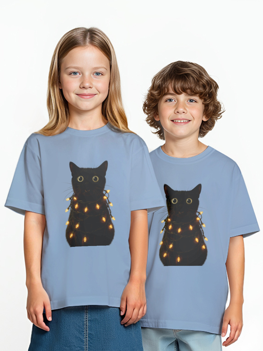 Детская оверсайз футболка «Смешной черный кот в гирлянде»
