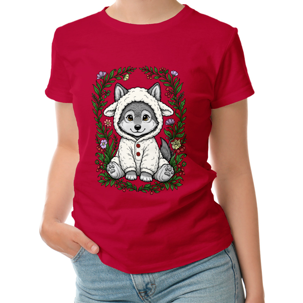 Женская футболка «Волчонок в овечьей кигуруми»